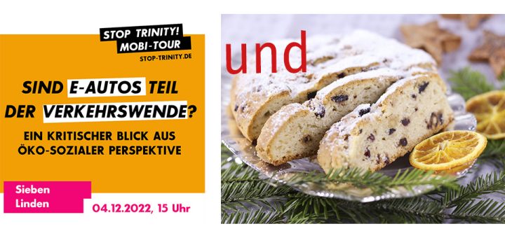 Neben Weihnachtsgebäck geht es thematisch um ein ungemütlicheres Thema, um die VerkehrsWende und um E-Mobilität am Beispiel VW Wolfsburg in dem Vortrag um 15 Uhr: Sind E-Autos Teil der Verkehrswende? Mit einem kritischen Blick aus öko-sozialer Perspektive berichtet Tobi Rosswog von großindustriellen Plänen und Protest-Aktionen aus der VW-VerkehrsWende-Stadt Wolfsburg und über seine Vision: die Transformation des größten Autokonzerns der Welt. Brauchen wir eine Antriebs- oder eine Verkehrswende – darüber können wir uns Informieren und diskutieren.