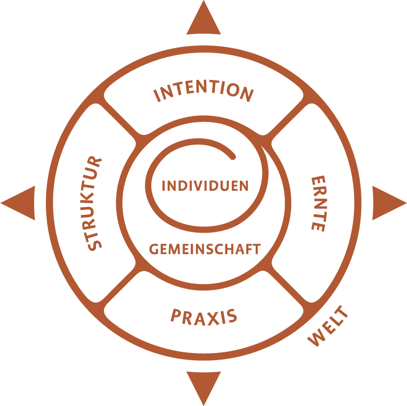 Individuen, Gemeinschaft, Intention, Struktur, Praxis, Ernte und Welt werden mit ihren Bedeutungen, Bezügen und Auswirkungen vorgestellt. Welche individuelle Haltung ist vorteilhaft, um in Gemeinschaft glücklich zu werden und Gemeinschaften gedeihen zu lassen? Wie kann der Gemeinschaftsgeist gepflegt werden? Warum ist eine gemeinsame Ausrichtung/Intention wichtig – und wann nicht? Welche Strukturen unterstützen gemeinschaftliche Prozesse? Wie kann mit den Themen „Macht und Hierarchie“ umgegangen werden? Welche Rechtsformen machen Sinn, wie können in der Praxis Finanzen und Ökonomie organisiert werden? Der Begriff Ernte erinnert daran, eine Feedback- und Wertschätzungskultur aufzubauen. Wie sorgen wir dafür, dass ein Projekt Synergieeffekte in der Welt aufbaut?