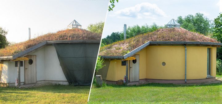 “ … doch war eben nochmal da und es ist wahr: das Haus der Stille ist enthüllt und gestrichen!!“ das habe ich an meine Mitbewohnenden vor ein paar Tagen geschrieben. Nach runden 10 Jahren ist das schützende Netz am Haus der Stille abgekommen, denn den Putz haben wir Mitte Juni gestrichen. Somit ist das runde Strohballenhaus mit der Glaspyramide auf dem Gründach nun auch an den Wänden dicht und regensicher. Jippiiii!!