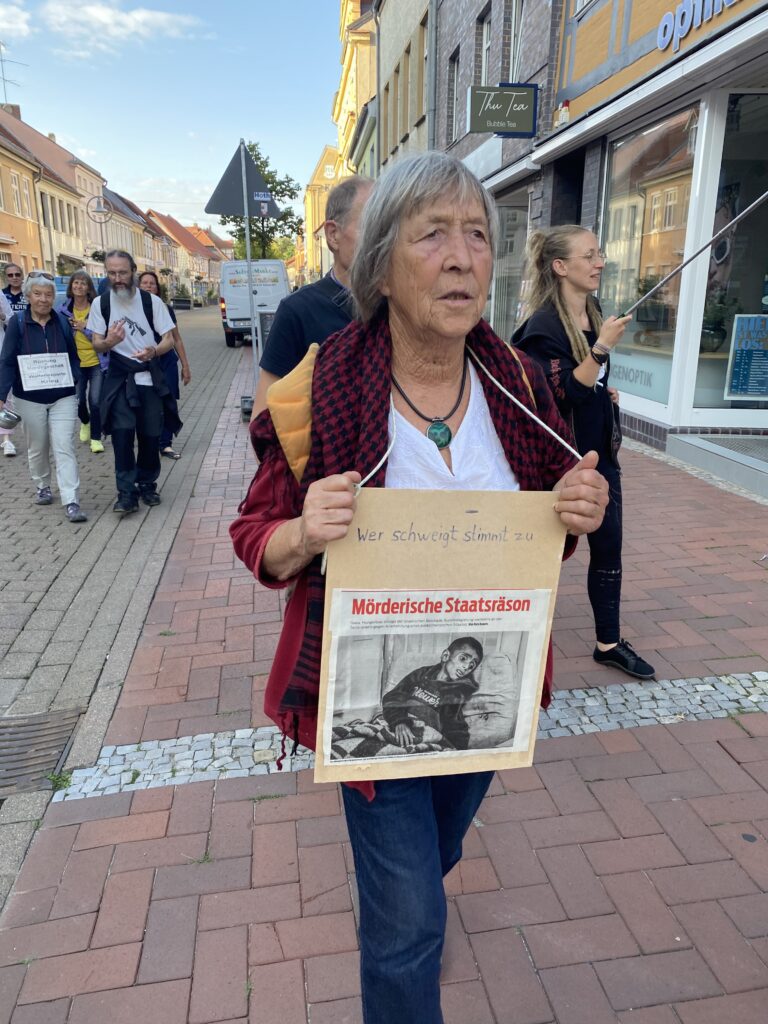 Irma Fäthke sprach am Montag auf der Friedensmahnwache im benachbarten Salzwedel, um die Öffentlichkeit auf die Notlage in Gaza und auf die deutsche Unterstützung des israelischen Völkermordes und Kriegsverbrechens aufmerksam zu machen. Dort berichtete sie auch, wieviel Hoffnung die leidenden Menschen in Palästina und auch ihre palästinensische Freundin Aida Shibli in Europa durch die weltweiten Proteste schöpfen. „Ein kleines Fenster der Hoffnung ist für manche wieder aufgegangen, dass Israel und Palästina zu einem Frieden kommen können.“