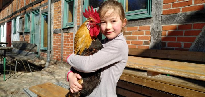 Frohe Ostern! Luna kuschelt mit ihrem Hahn und freut sich über das große Fest in unserer Gemeinschaft. Viele von uns empfindetn die zwei kleinen Hühner-Scharen, die seit Kurzem im Ökodorf leben, als Bereicherung. Häufig laufen die Tiere auch frei umher, scharren, picken. Geschlachtet werden sie nicht, Eierlegen dürfen sie.