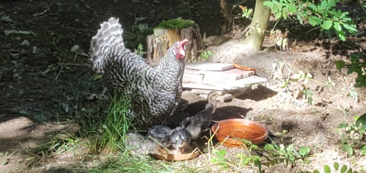 Zu unserer einsamen „Mathilda“, eine Henne der Rasse „Deutscher Sperber“, hat sich nun eine zweite „Deutsche Sperber-Henne“ und 5 Küken gesellt. Die Henne ist nur als Amme da, und wird nach einer Weile zusammen mit den männlichen Küken wieder in ihr ursprüngliches Zuhause zurückkehren. Die weiblichen Küken werden zusammen mit Mathilda in Sieben Linden die Menschen mit ihrem angenehmen Wesen und ab und zu auch mal einem Ei erfreuen.