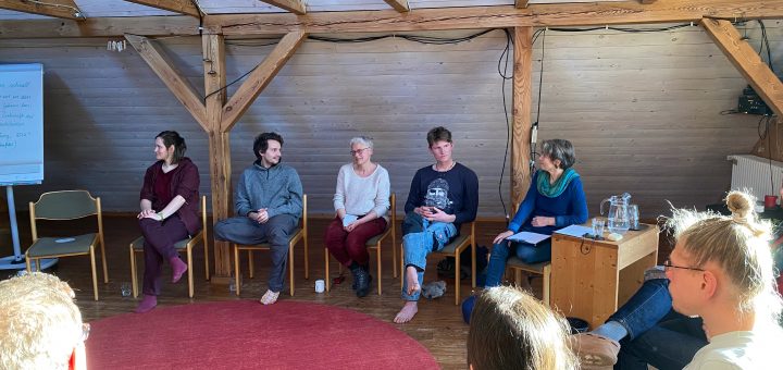 Podium im Ökodorf Sieben Linden ein: Anja (Letzte Generation), Carl (Klimagerechtigkeit, zuletzt