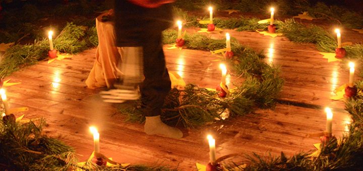 Eine riesengroße Spirale aus Kieferngrün am Boden, der Nadelbaumduft in der Luft und in der Mitte eine stattliche Kerze. Instrumentalmusik, Weihnachtslieder, ein Kind nach dem anderen durchschreitet die Spirale mit einer eigenen Kerze und entzündet diese an der Flamme im Zentrum. Auf dem Rückweg wird die Kerze am Spiralweg abgestellt. Ein junger Mensch nach dem anderen durchläuft die Formationen und macht sich für die anderen sichtbar. Die meisten bewegen sich langsam, fast andächtig, manche auch unsicher oder eilig. Die Menschen im äußeren Kreis nehmen heute wahr, wie die Kinder sich entwickelt haben im Jahresverlauf. Unsere Augen sind Zeugen, wie das Licht sich vervielfacht, ausbreitet – nach und nach erleuchten die Kerzen der Kinder wunderschön die ganze Spirale.