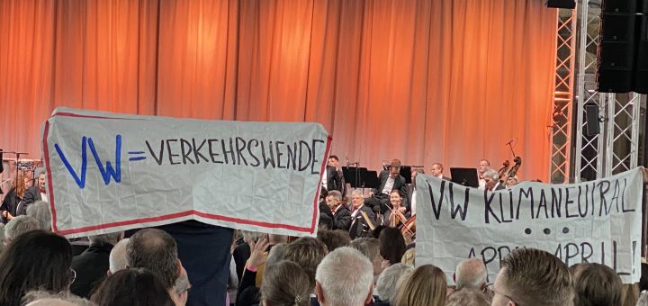 Die Frankfurter Philharmonie spielt ihren letzten Ton und der Applaus erklingt. Dann stehen im Publikum verteilt Menschen auf den Stühlen und entfalten fünf Transparente: „VW = VerkehrsWende“ steht da, und „Endlich Frühling: Zeit für Veränderung. ÖPNV statt Autobau.“ oder „Greenwashing bei VW? Leider kein Aprilscherz“. Dabei waren die Transparente doppelseitig beschrieben: In Richtung Orchester war für die Musiker:innen „Vielen Dank“ zu lesen und auf der anderen Seite die politischen Botschaften.